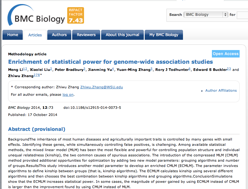 青年教师李梦在全基因组关联分析方法的改进方面取得重要进展,以一作者身份发表论文“Enrichment of Statistical Power for Genome-Wide Association Studies”。该论文于10月17日在杂志BMC biology(IF=7.43)在线发表(//www.biomedcentral.com/1741-7007/12/73/abstract)。本文也是作者与美国康奈尔大学Ed Buckler实验室及美国华盛顿州立Zhiwu Zhang合作研究的成果。南京农业大学为第一完成单位。