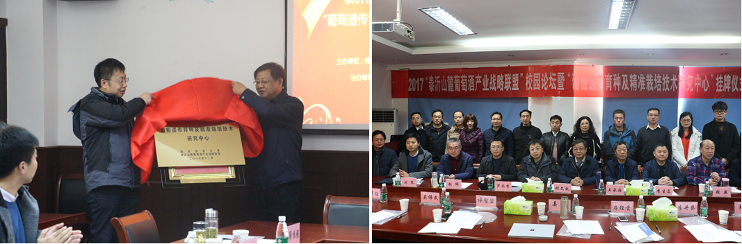 果树遗传育种与基因组学研究团队的教师与研究生以及对葡萄酒文化有兴趣的本科生等。姜东院长与联盟主席日照太阳城生物科技有限公司董事长王承海分别致辞。姜东院长与山东省葡萄与葡萄酒协会会长(原山东省葡萄研究院院长)胡文效研究员共同为“葡萄遗传育种及精准栽培技术研究中心”的成立揭牌。并举行了“泰沂葡萄酒产业战略联盟”与加拿大28