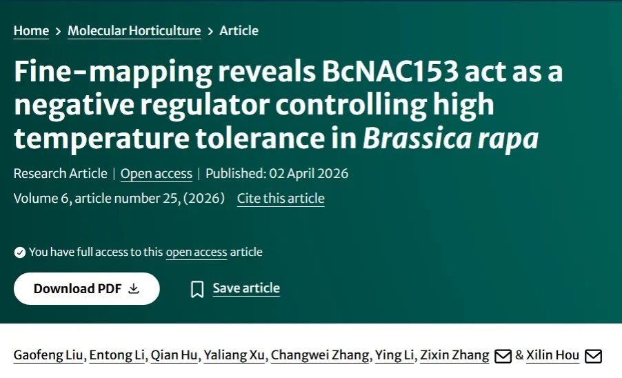 近日,《Molecular Horticulture》在线发表了南京农业大学侯喜林教授团队题为“Fine-mapping revealsBcNAC153act as a negative regulator controlling high temperature tolerance inBrassica rapa”的研究论文。该研究通过构建高密度遗传图谱,成功鉴定到一个调控不结球白菜高温耐受性的关键负调控因子BcNAC153,并系统解析了其在高温胁迫响应中的作用机制,为耐热蔬菜品种的分子育种提供了新靶点。