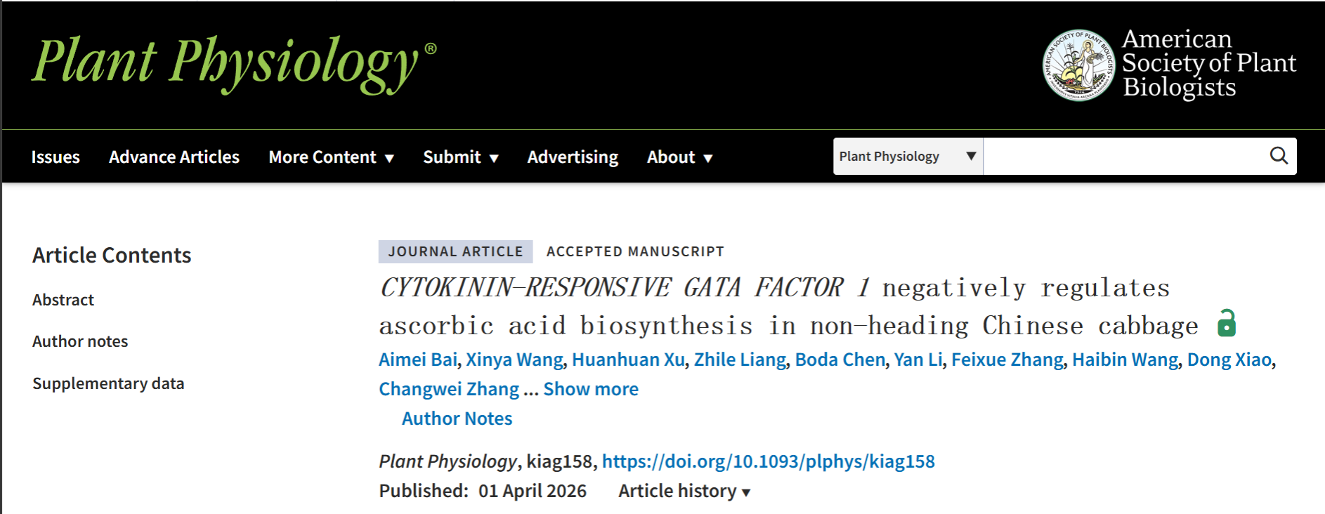 近日,南京农业大学加拿大28 白菜系统生物学实验室在国际植物学期刊《Plant Physiology》在线发表题为“CYTOKININ-RESPONSIVE GATA FACTOR 1 negatively regulates ascorbic acid biosynthesis in non-heading Chinese cabbage”的研究论文,该研究锁定了调控AsA积累的关键GATA转录因子BcCGA1,揭示了BcCGA1通过直接抑制AsA合成关键基因转录负调控AsA积累的分子调控机制,为不结球白菜营养品质的分子改良奠定了遗传基础。